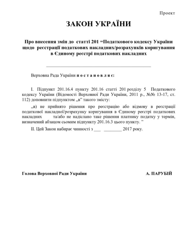 Министерство финансов разработало законопроект "О внесении изменений в статью 201 Налогового кодекса Украины относительно регистрации налоговых накладных/расчетов корректировки в Едином реестре налоговых накладных".