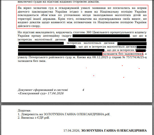 Факт 2. 17 квітня 2026 року, за 24 години до цього, Національна поліція України подала до Київського апеляційного суду офіційний документ - відзив у справі № 757/7434/25-ц. У якому чорним по білому написано, що поліція не зобов'язана шукати зниклих дітей. У задоволенні заяви про захист малолітніх прохання - відмовити.
