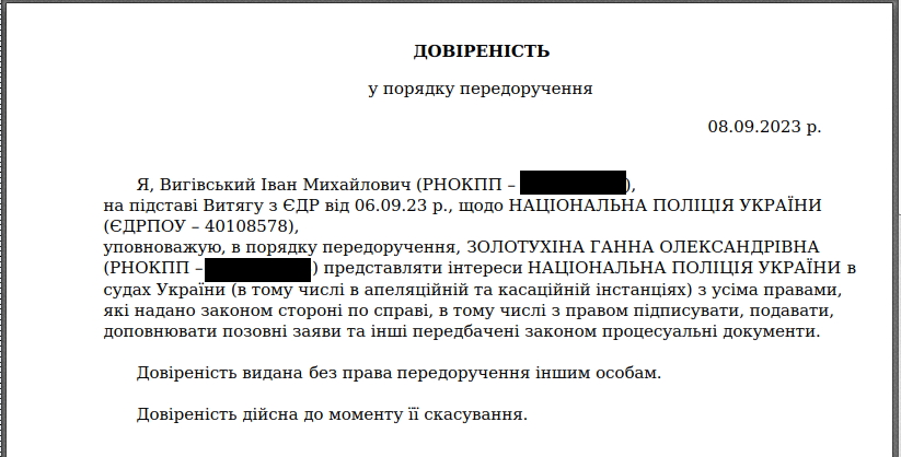 Підпис під документом: Золотухіна Ганна Олександрівна. Вона представник Національної поліції України за довіреністю безпосередньо від Вигівського Івана Михайловича.