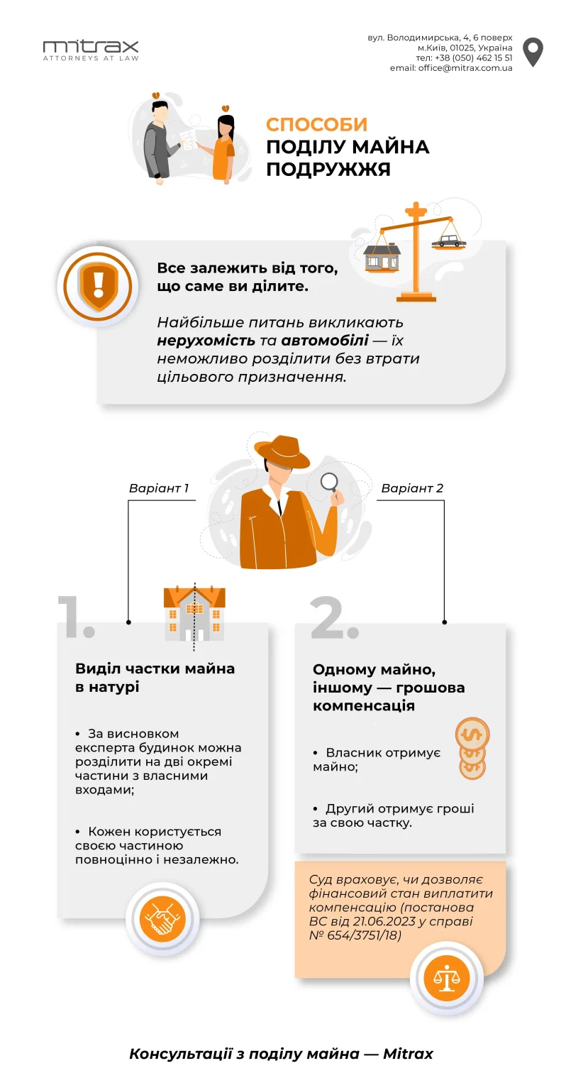- Одному майно, а іншому — компенсація вартості його частки у цьому майні.